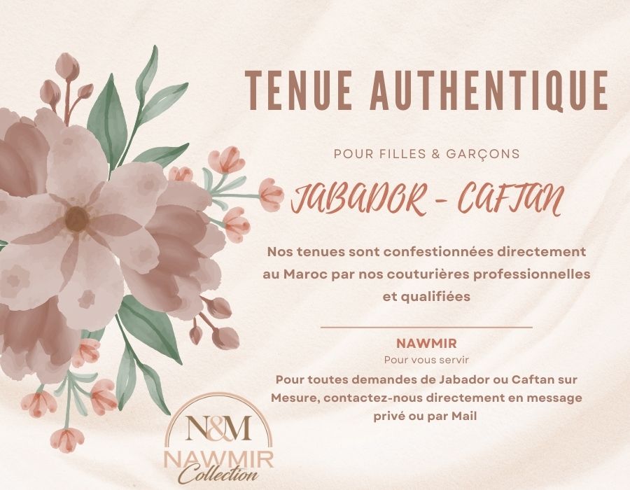 Chaque rencontre nous a inspirĂ©s, chaque tissu nous a Ă©merveillĂ©s. Aujourd'hui, NAWMIR est le fruit de cette quĂȘte. Nos jabadors ne sont pas de simples vĂȘtements, mais des Ćuvres d'art qui racontent l'histoire de notre culture. En choisissant NAWMIR, vous offrez Ă votre enfant un morceau de notre hĂ©ritage marocain et soutenez un artisanat prĂ©cieux. Rejoignez-nous dans cette belle aventure. Ensemble, habillons nos enfants d'Ă©lĂ©gance et de tradition.